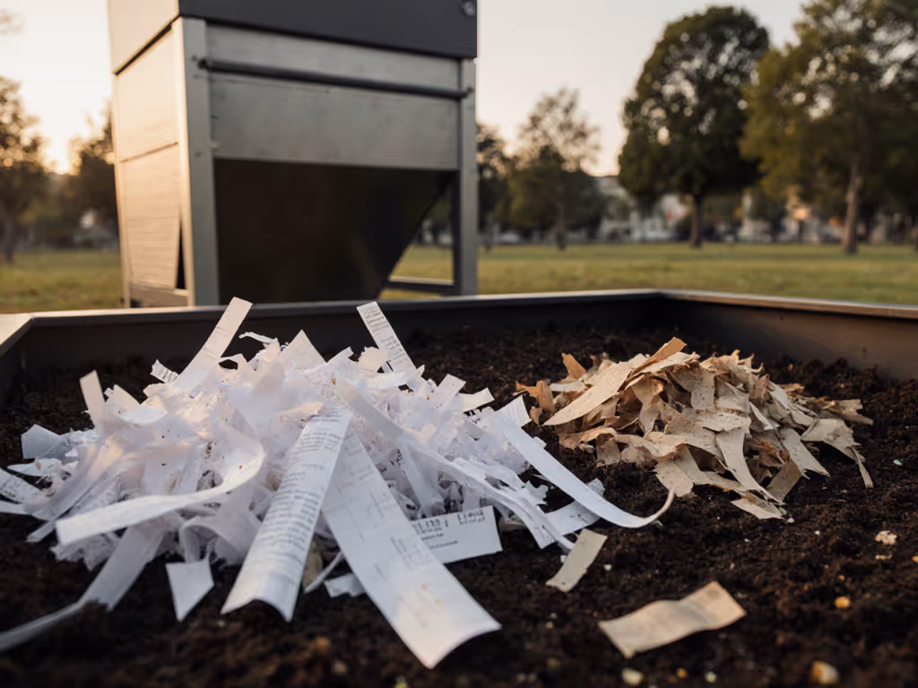 Note: Actual composting of shredded office paper requires verification that your local compost facility accepts paper products and confirmation that the stock is free of synthetic coatings. Standard office paper generally composts readily; shredded mail with plastic windows does not. Check locally before assuming your bin is compostable.